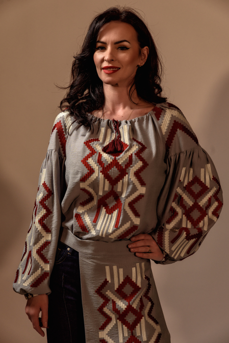 Bluza cu broderie in nuante de burgundy si ivory