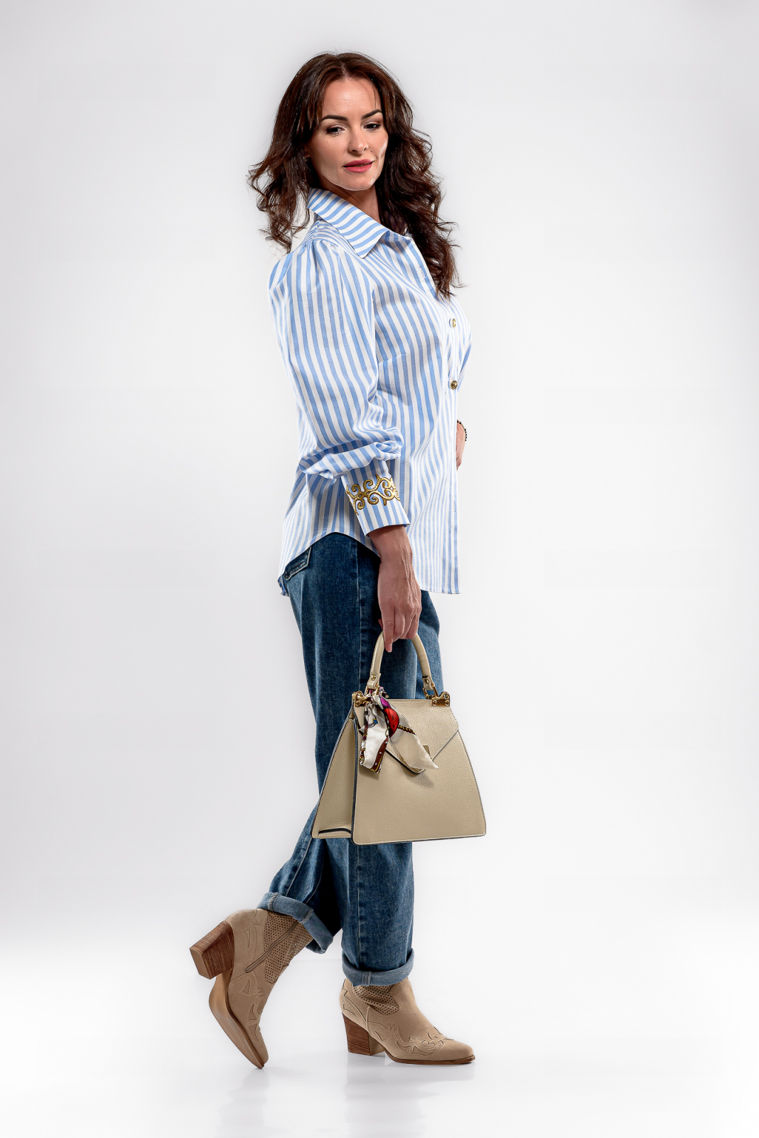 Camasa oversize cu dungi bleu-alb si detalii vintage aurii