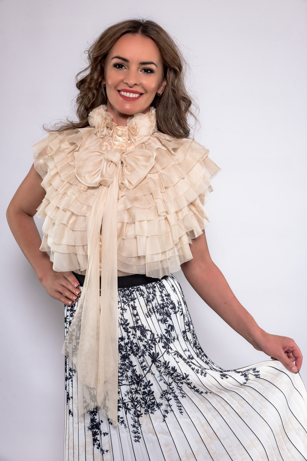 Bluza voal foarte fin bej – o bluză delicată din voal fin, cu volane multiple în față și o fundă la gât, pentru un detaliu rafinat.