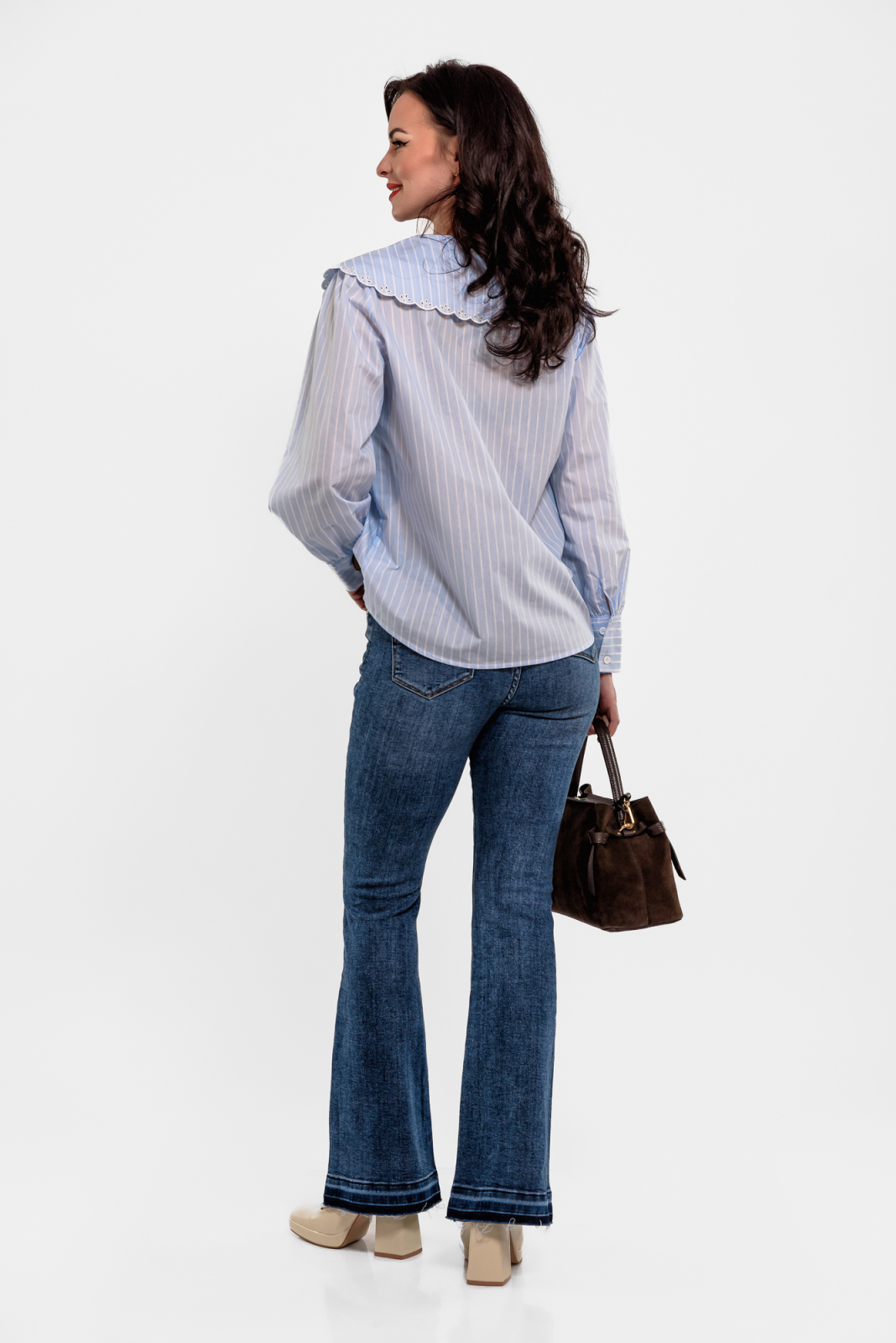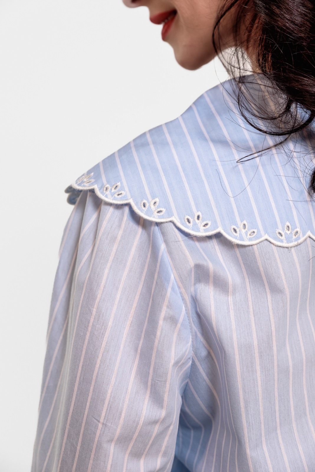 Camasa poplin bumbac 100% cu dungi alb-bleu, guler mare cu broderie sparta