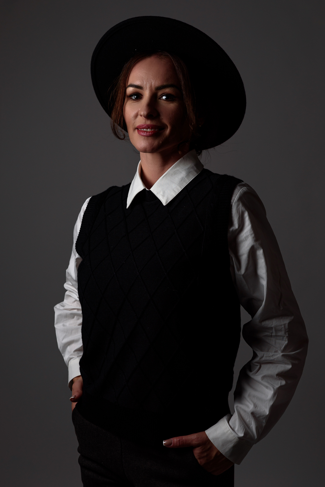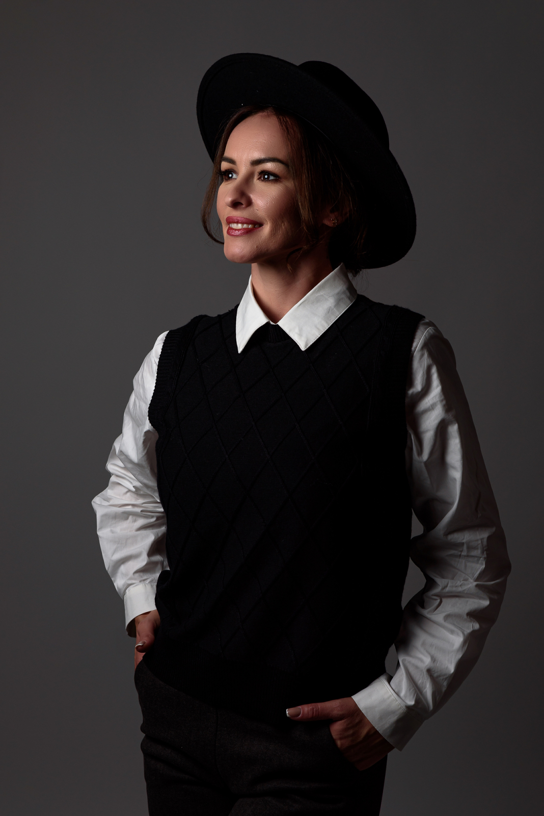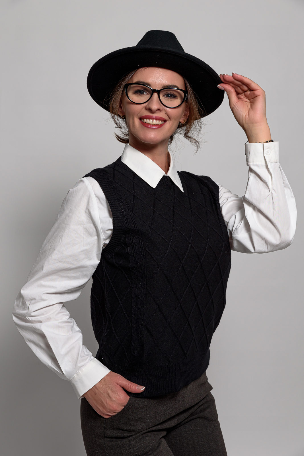 Cămașă din poplin cu vestă tricotată – o cămașă albă scurtă din poplin 100% bumbac, combinată cu o vestă tricotată neagră. Cămașa este confortabilă și versatilă, potrivită pentru mărimile 38-40.