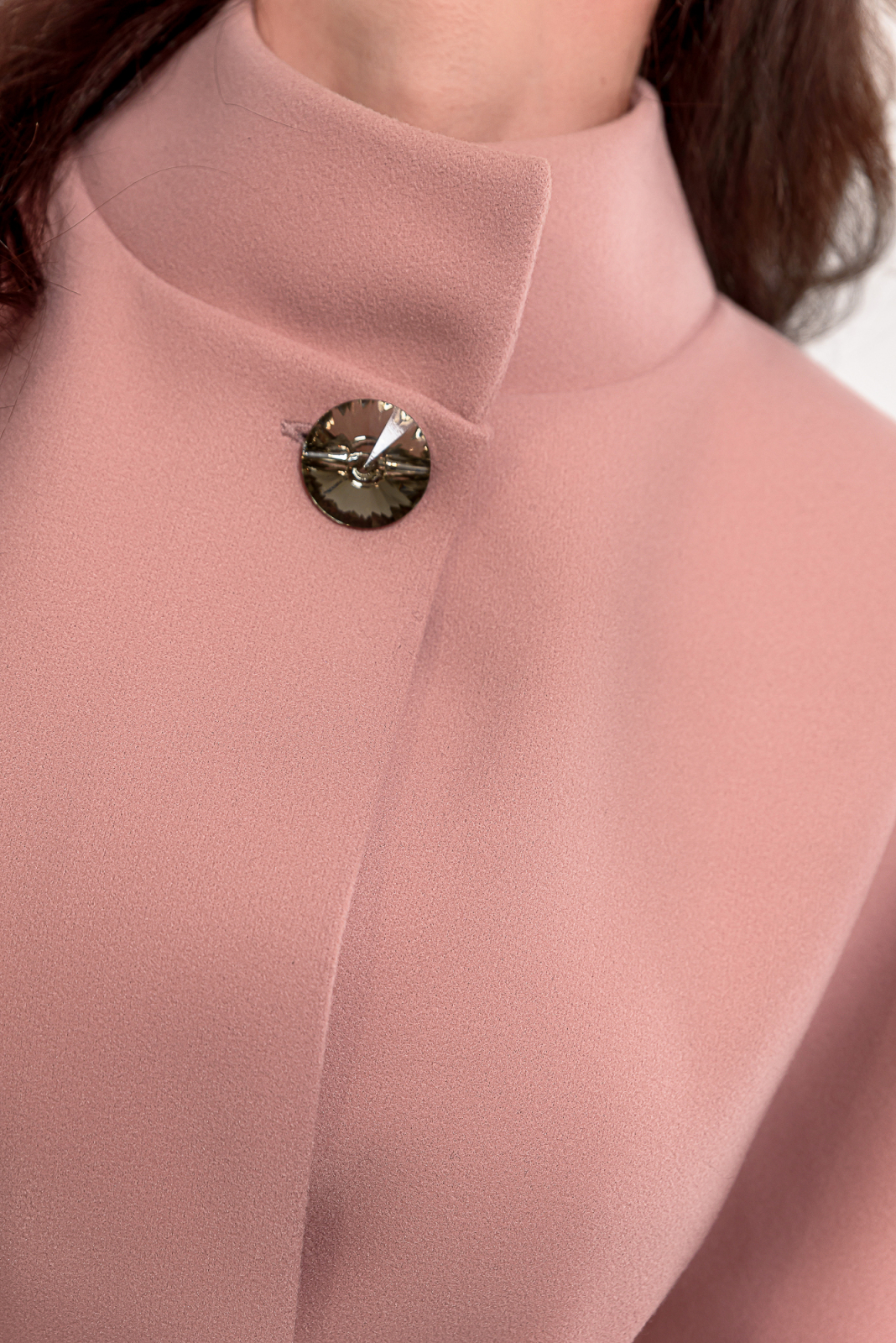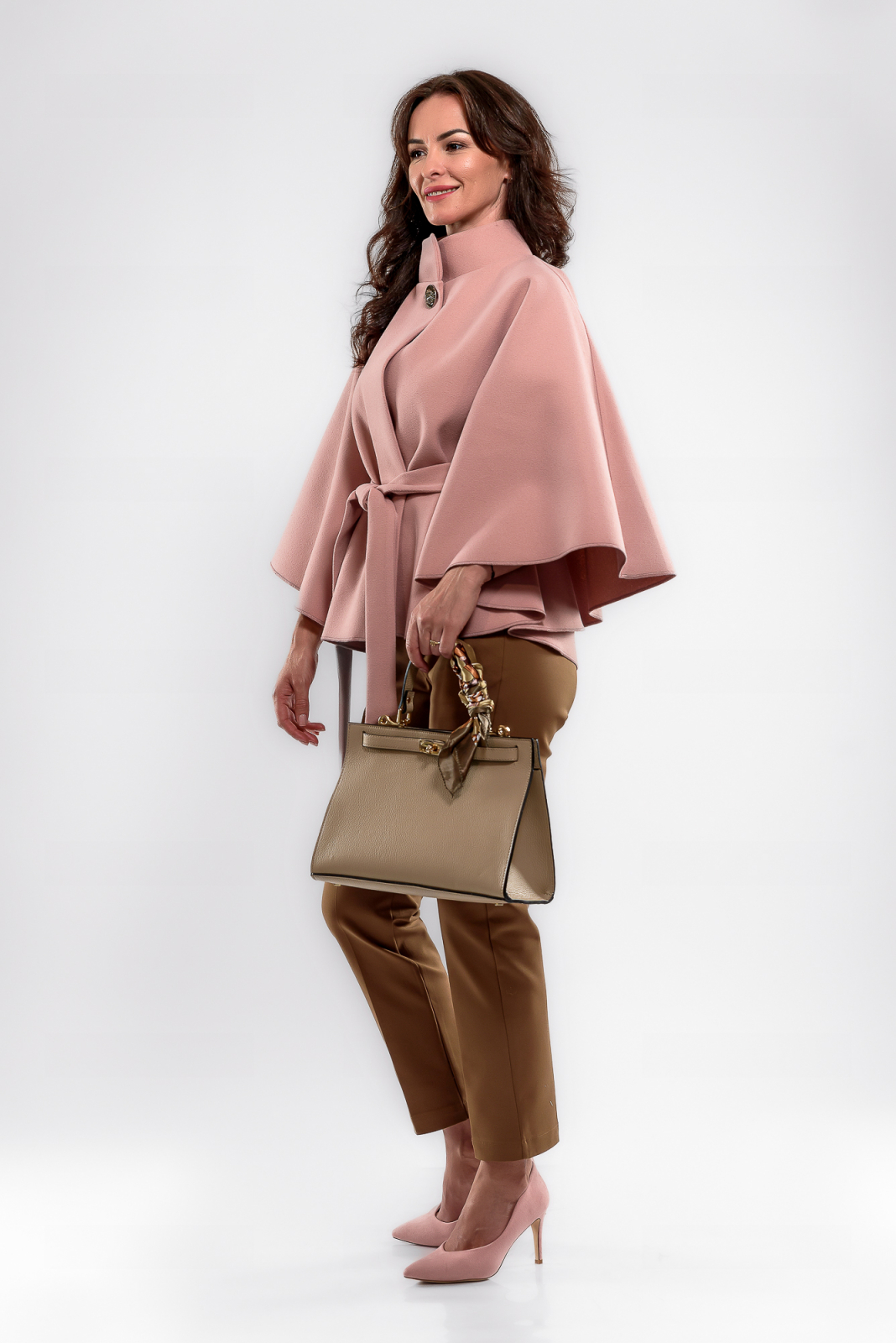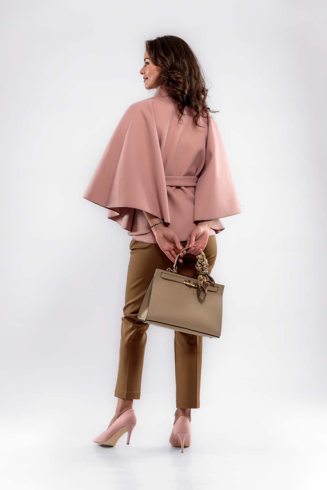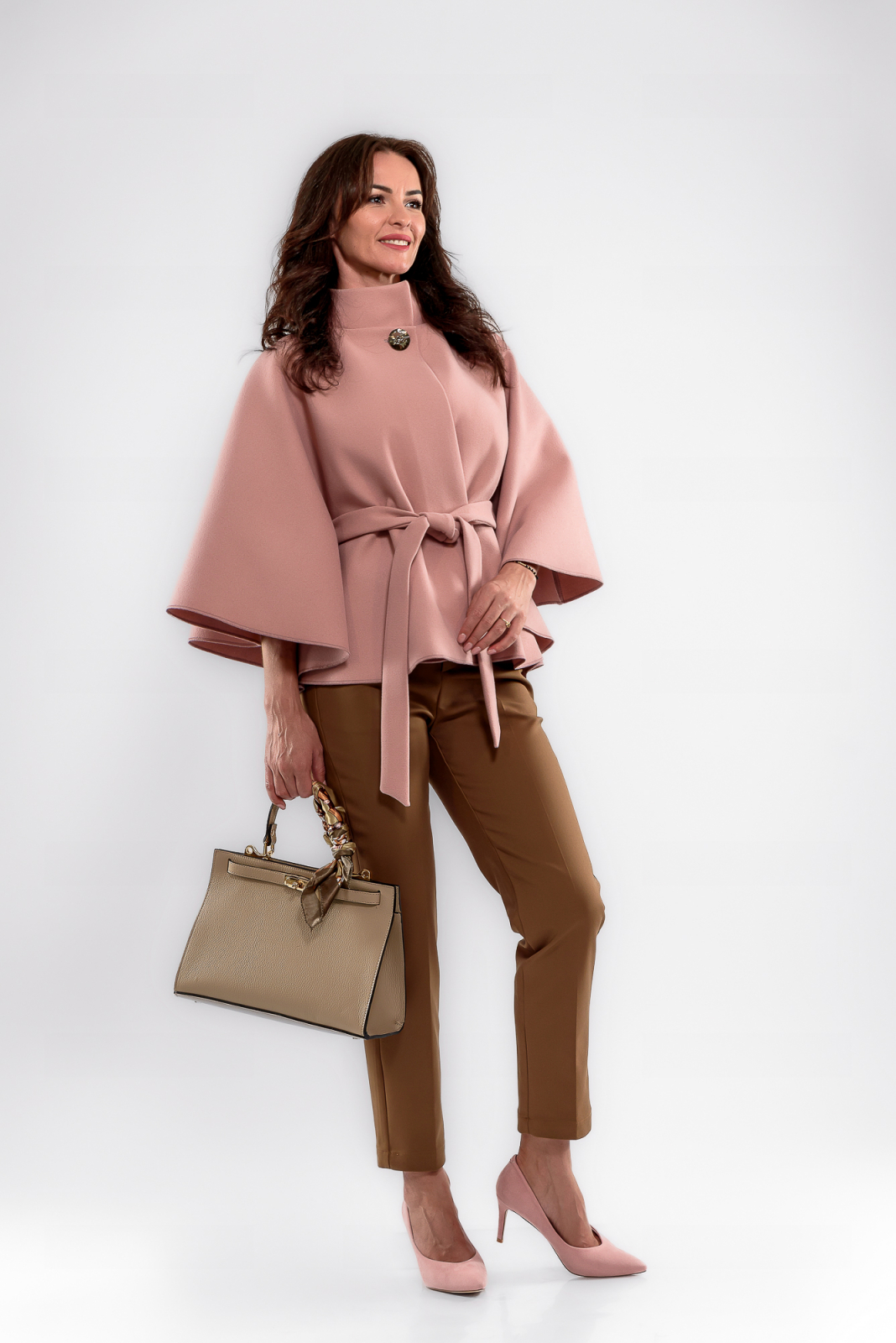• Capă scurtă din stofă roz pudra, cu o croială lejeră