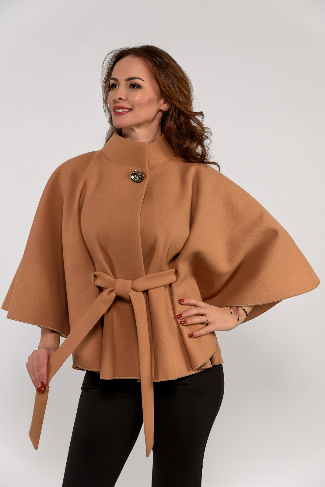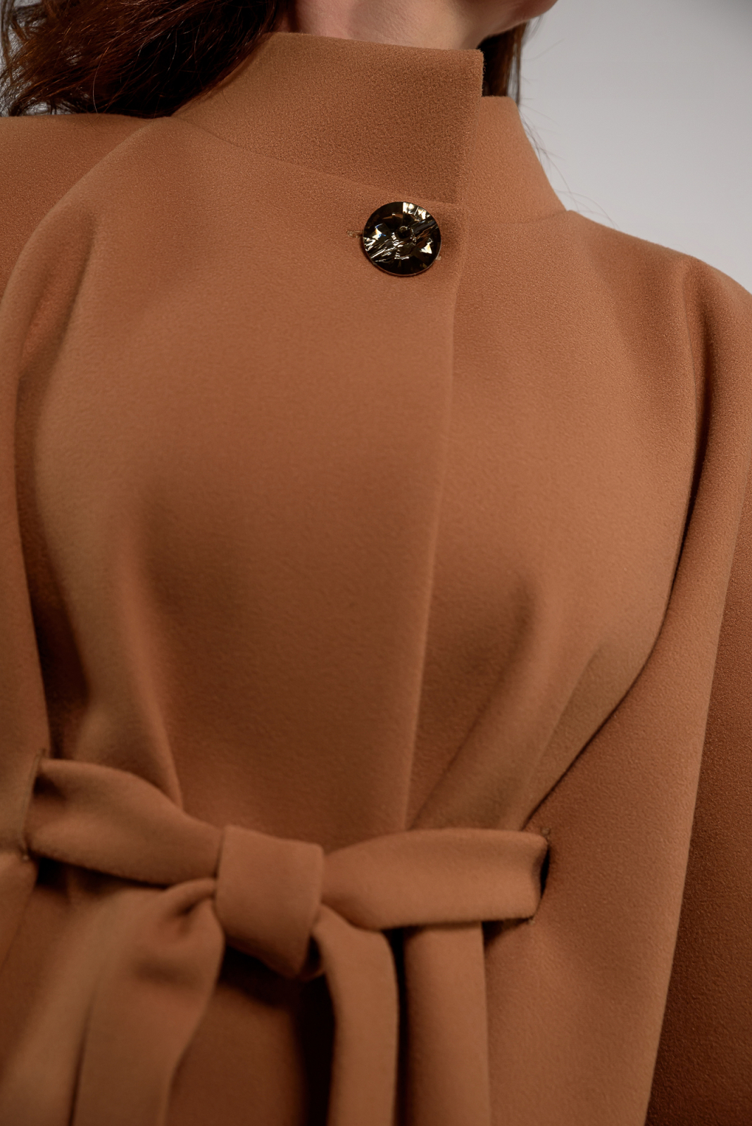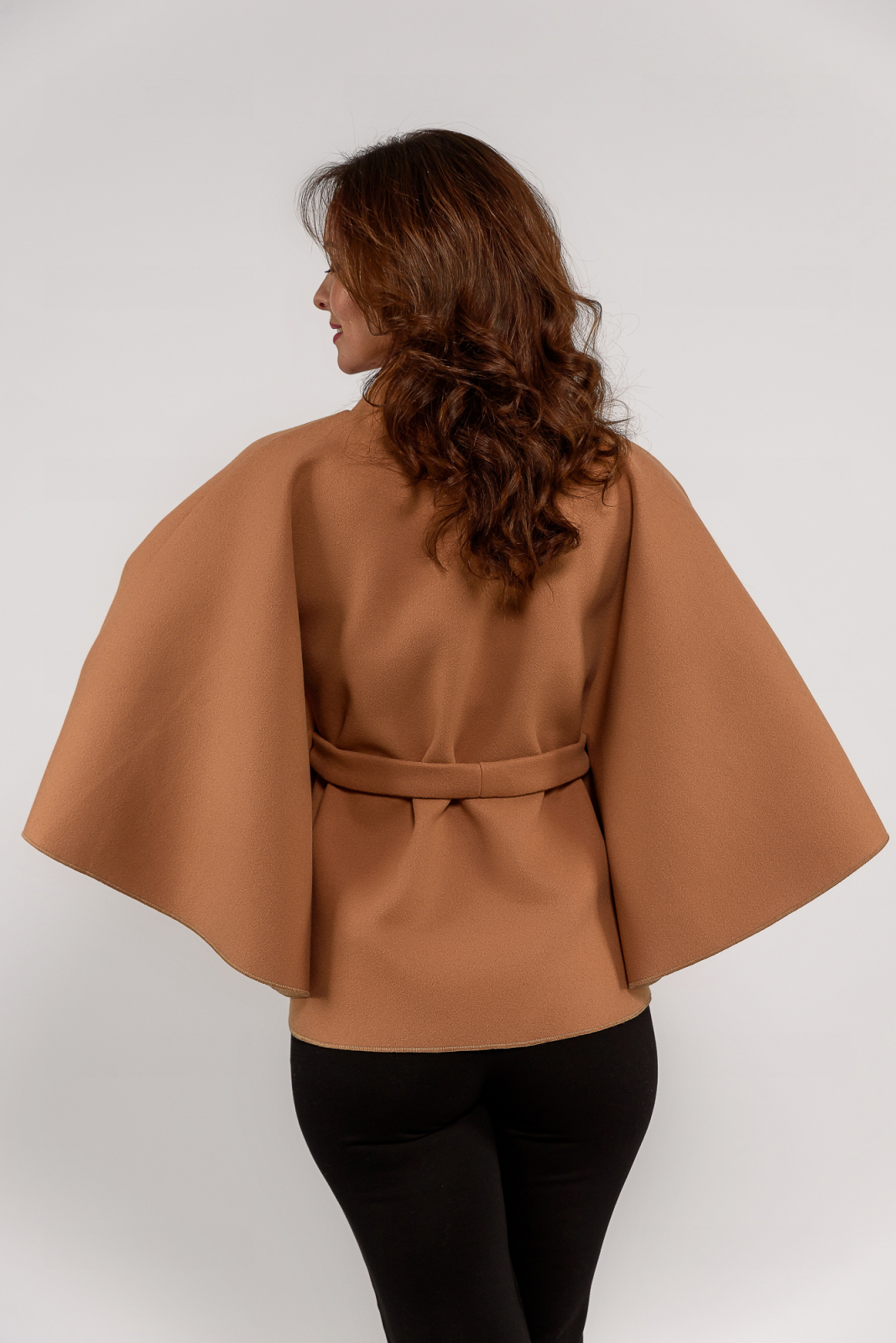Capă scurtă din stofă nuanța ciocolată cu lapte, necăptușită, cu cordon în talie.