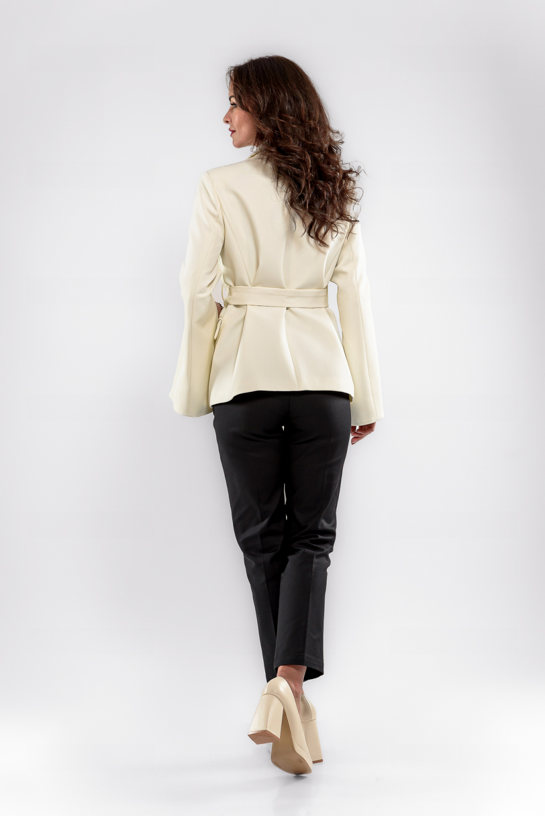 Un sacou negru statement, creat să atragă toate privirile prin detaliile sale spectaculoase. Cu mâneci despicate până la cot, lasă să se întrevadă o notă subtilă de senzualitate și rafinament. Închiderea la două rânduri de nasturi îmbrăcați se completează armonios cu cordonul din talie, ce conturează silueta într-un joc perfect între forță și feminitate.