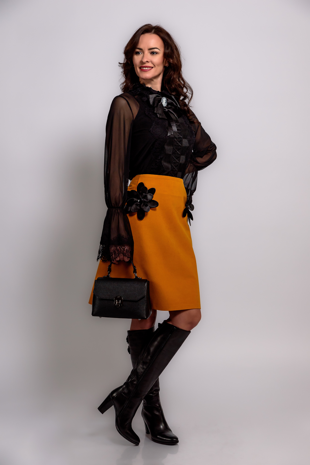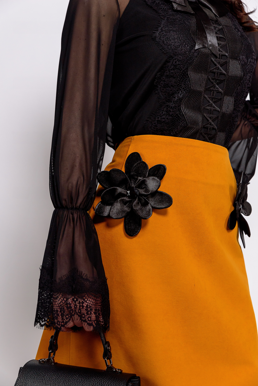 • Fustă din catifea muștar cu flori negre satinate handmade
