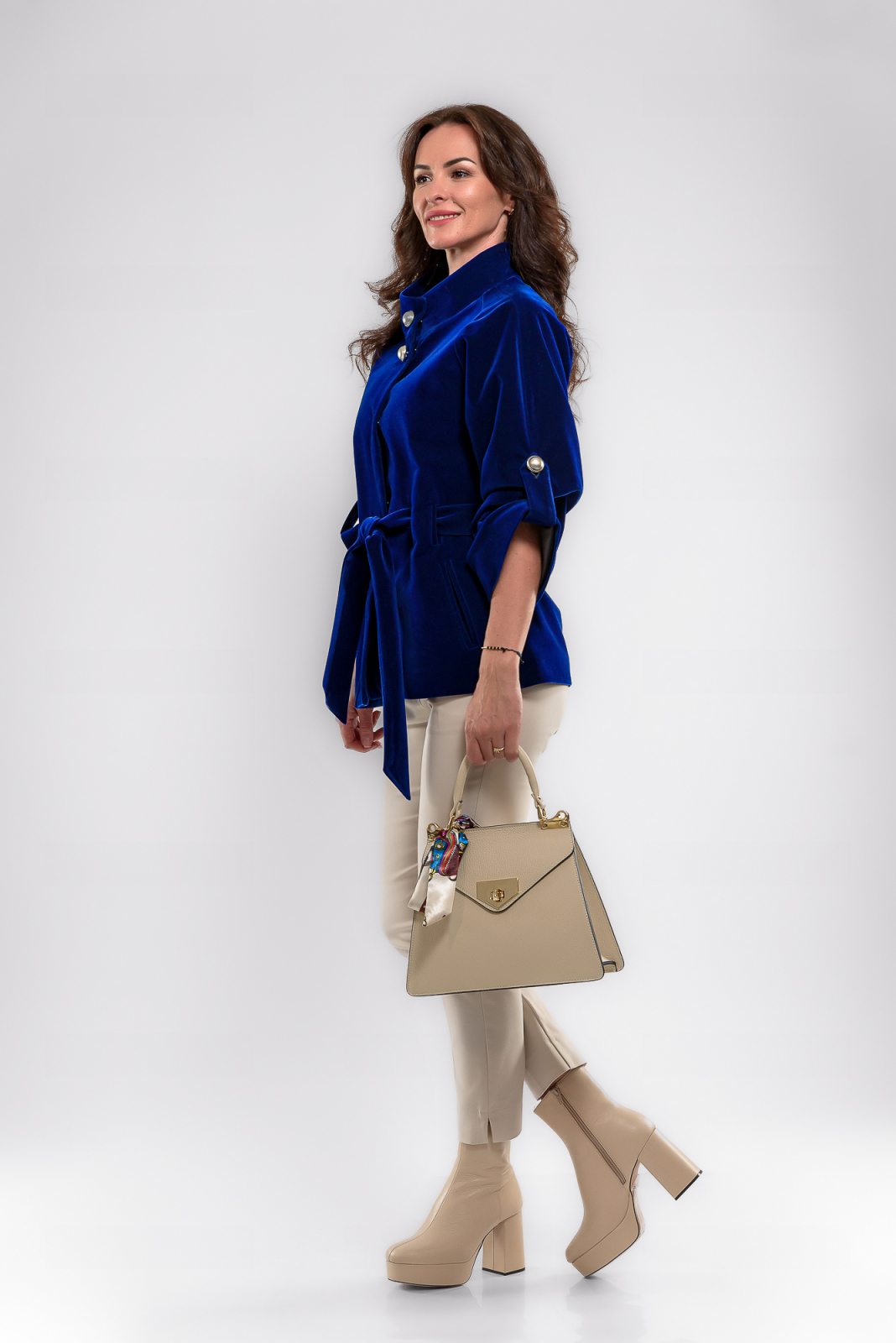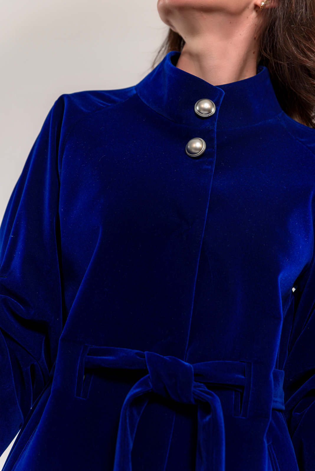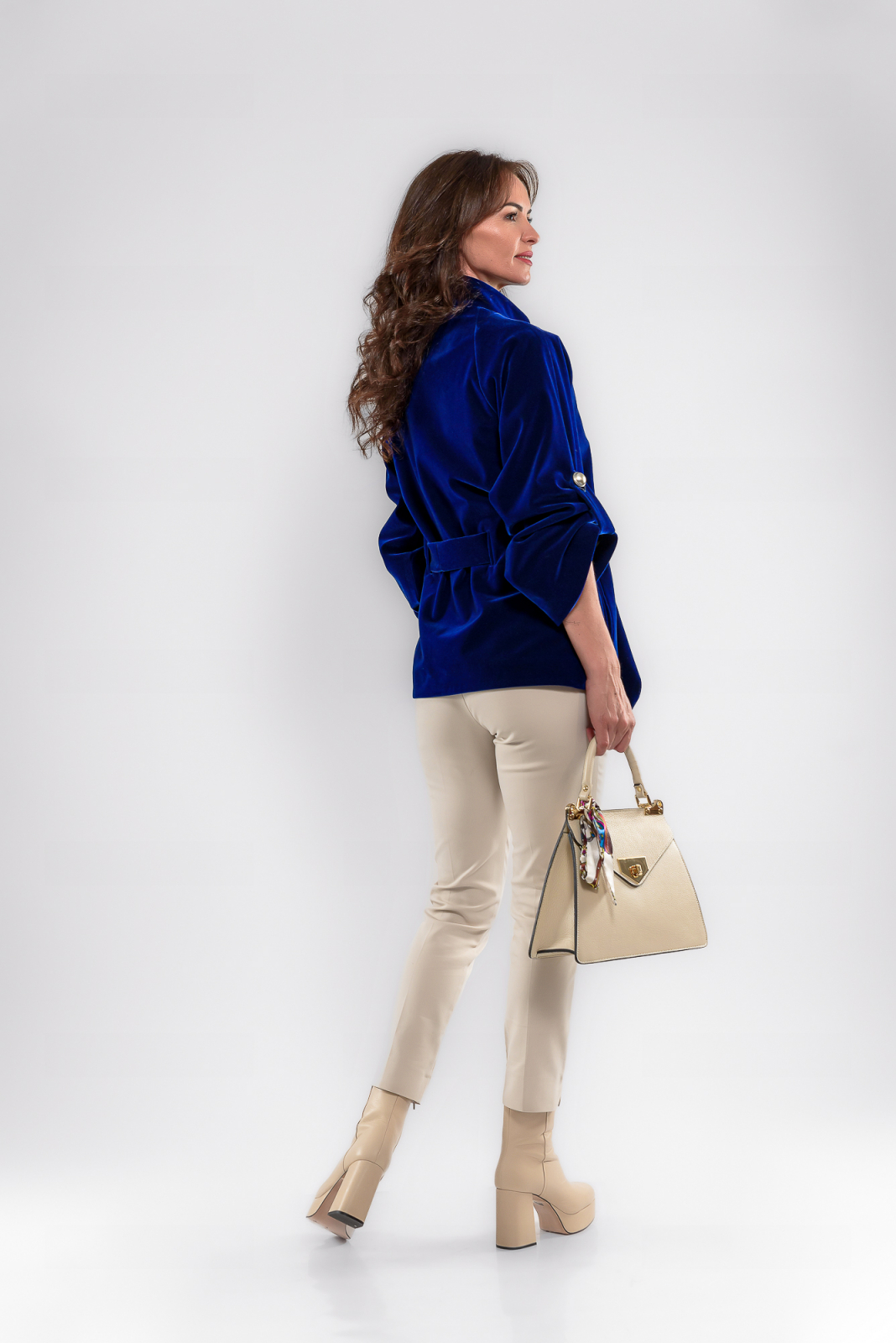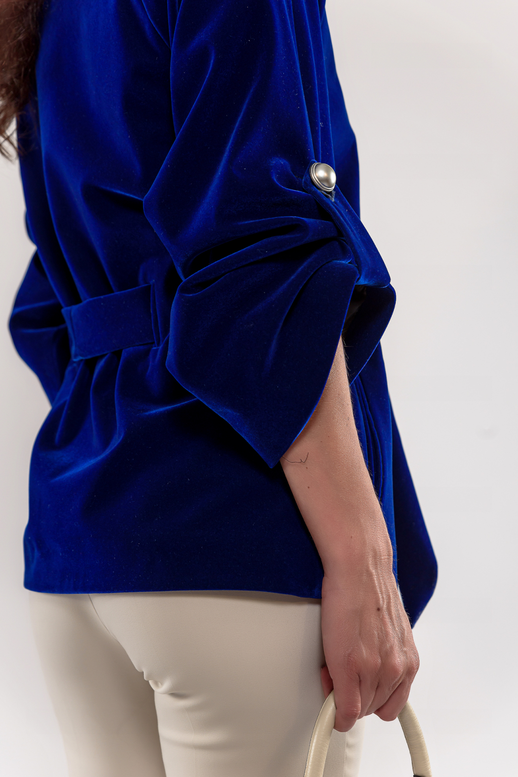 O jachetă din catifea regala albastra , cu croi drept și detalii elegante, ideală pentru sezonul de toamna iarna