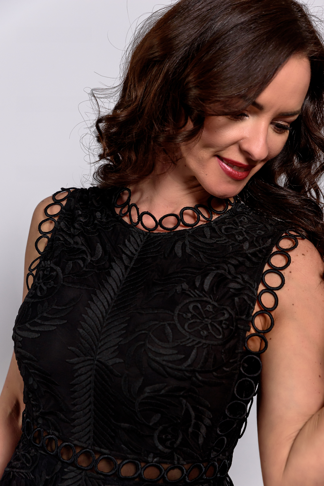 Un model elegant din dantelă brodată, cu volane delicate și detalii sofisticate, ideal pentru o apariție plină de rafinament.