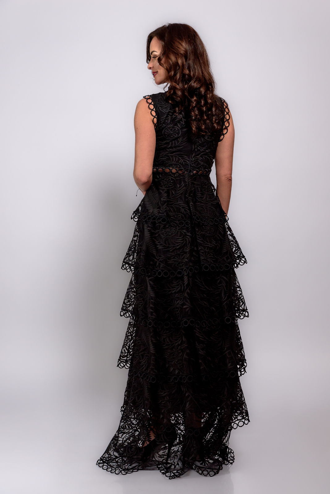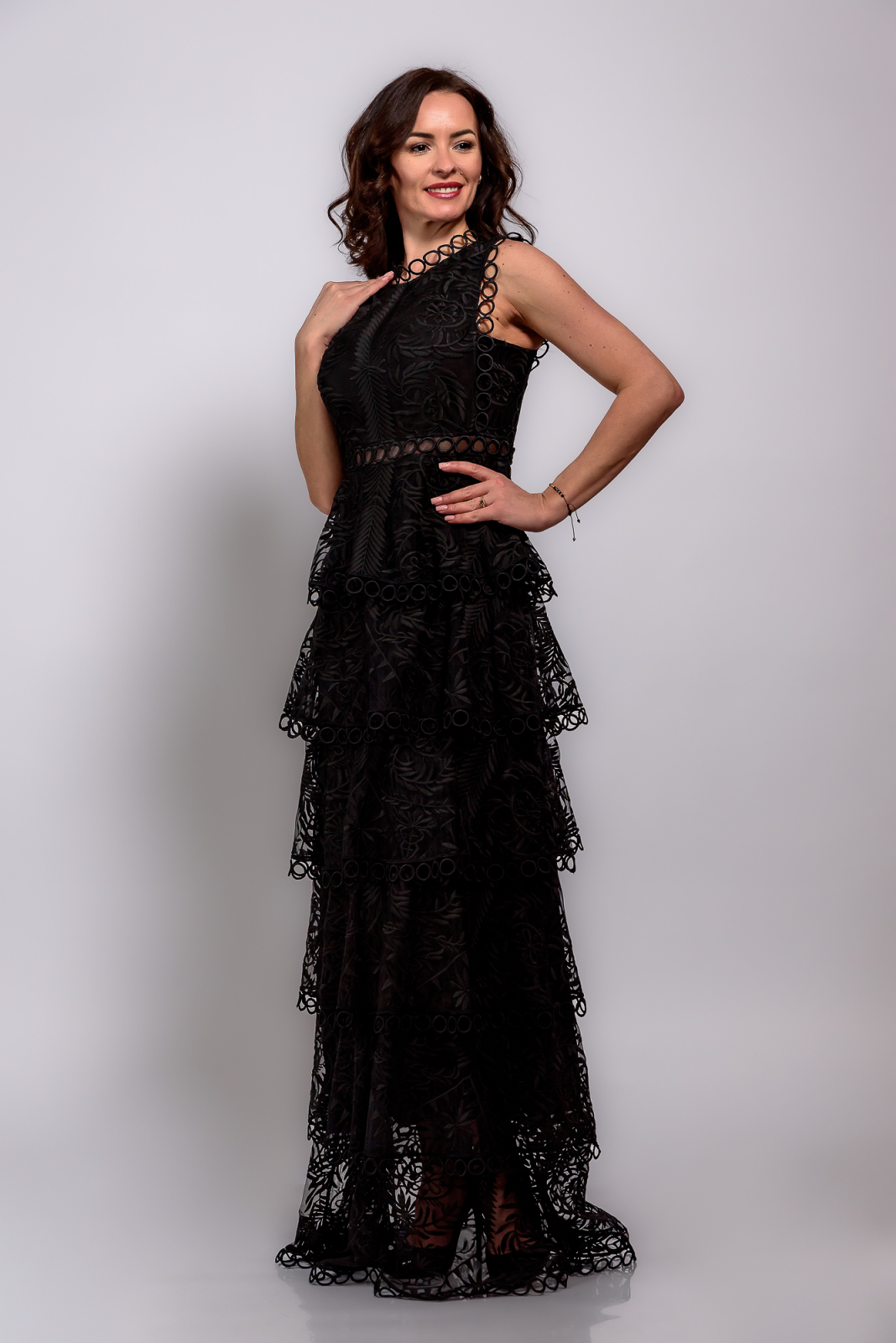 Rochie de ocazie lungă din dantelă cu detalii rafinate – un model sofisticat, cu dantelă brodată prețioasă și volane ample ce adaugă eleganță și rafinament, completat de o căptușeală elastică pentru un plus de confort și o potrivire impecabilă.