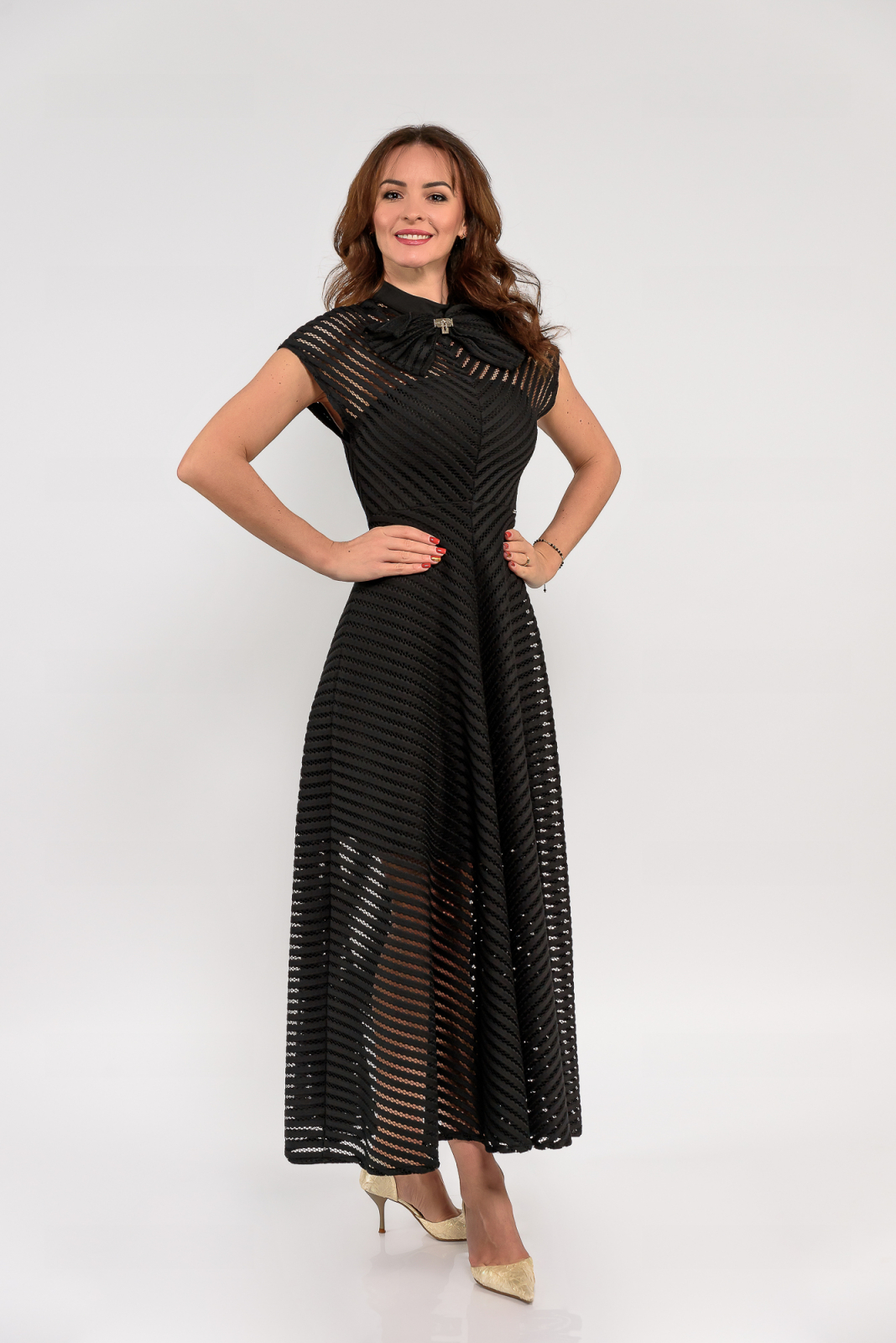 Rochie lungă cu dantelă și detalii elegante – un model rafinat, cu croială în cloș și dungi pline combinate cu zone transparente, care creează un efect modern și delicat. Căptușeala midi separată oferă confort și discreție, iar funda de la gât și ornamentul auriu adaugă un plus de eleganță.