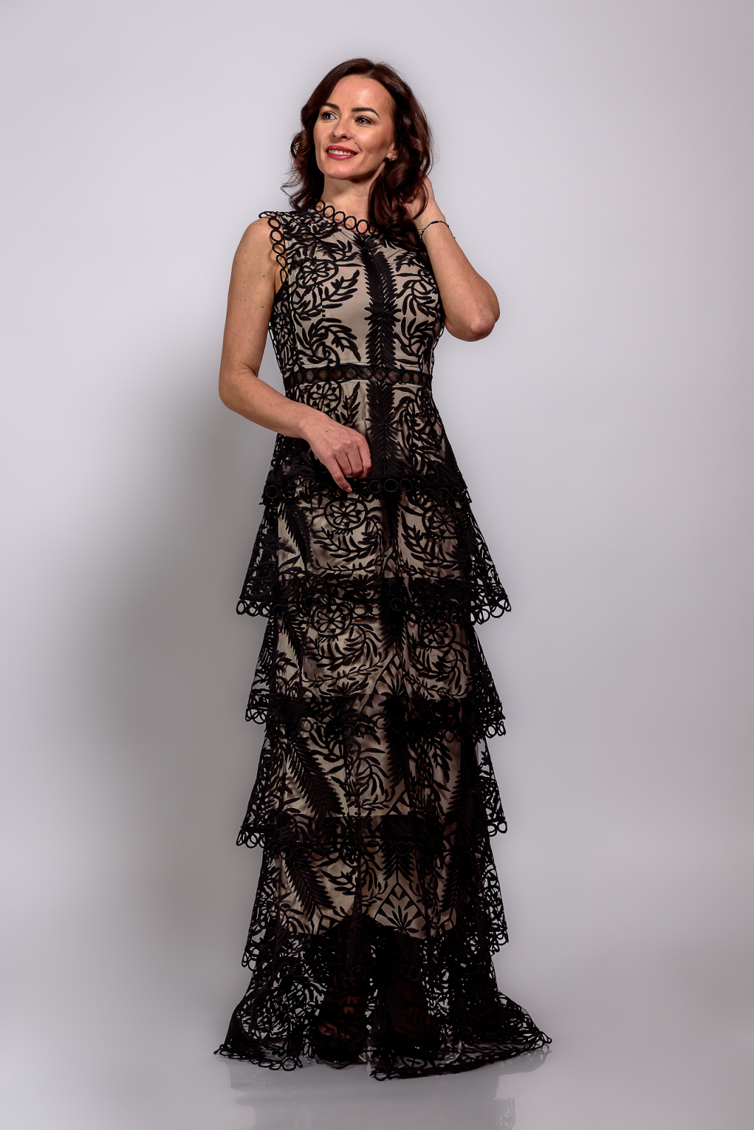Rochie lunga glamour din dantela neagra cu detalii rafinate