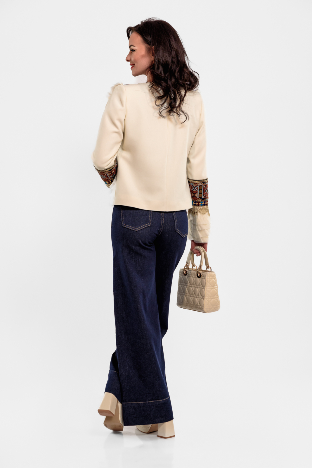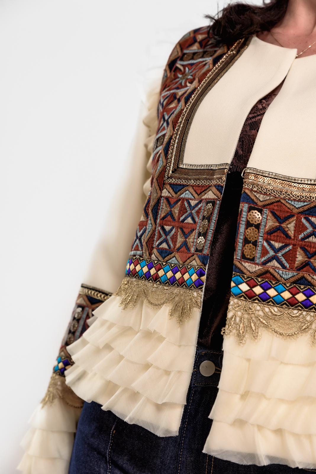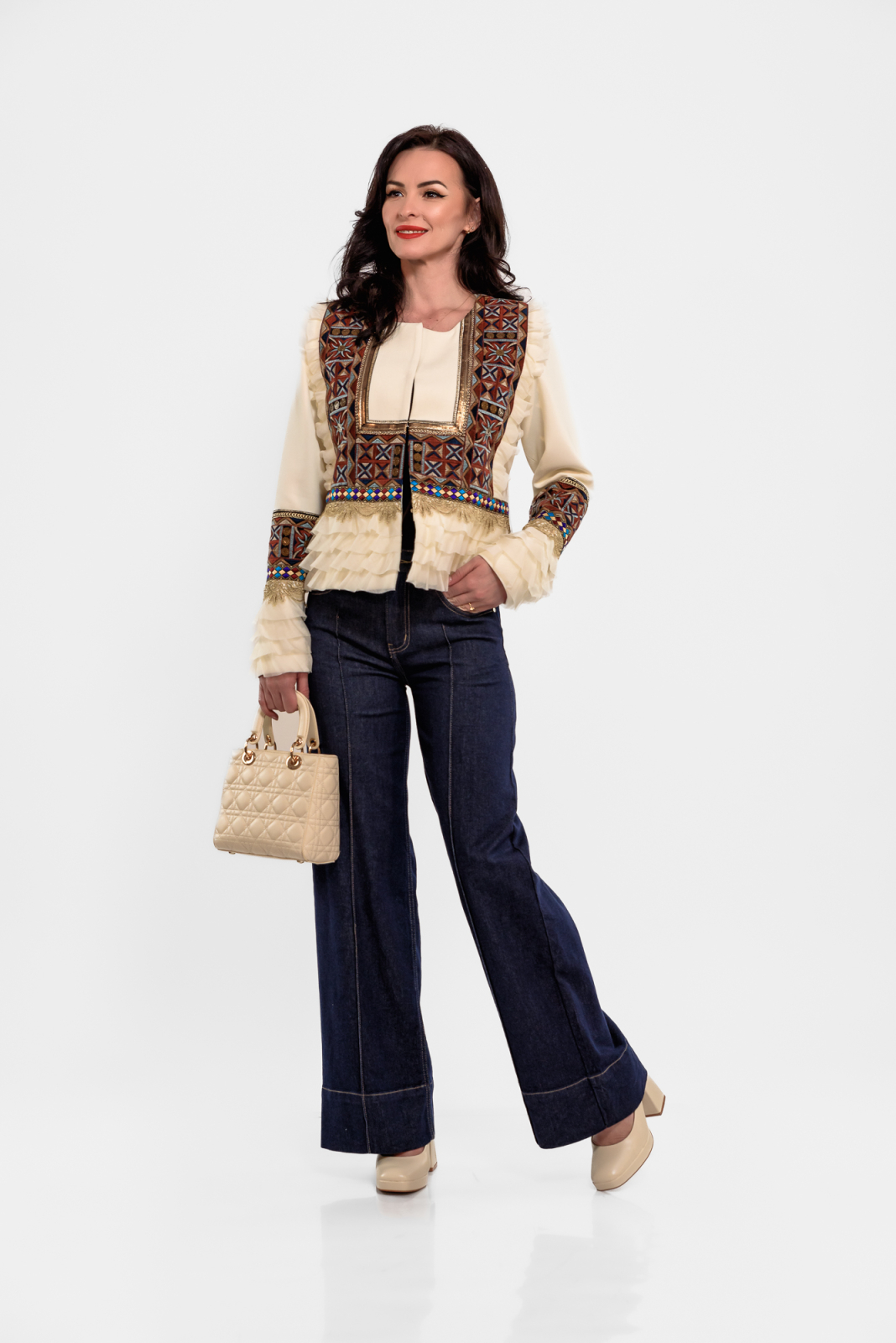 Sacou Effect crem cu broderie decorativa si volanase