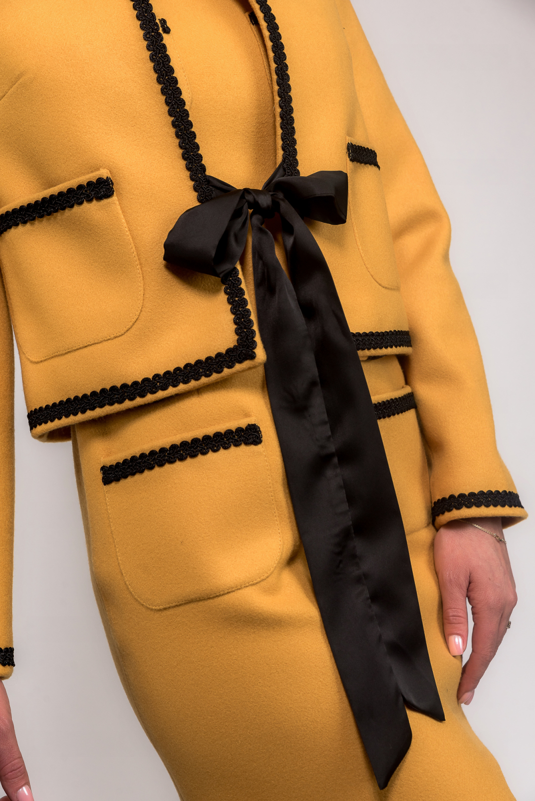 Sacou stofă galben – un sacou galben din stofă de grosime medie, accesorizat cu șnur împletit din bumbac și închidere cu funda din satin, ideal pentru ținute chic și moderne.